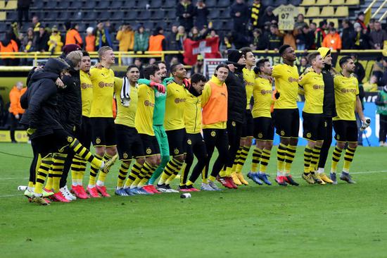 2月29日,多特蒙德队球员在德甲比赛后庆祝。新华社发(约阿希姆·毕瓦勒兹摄)