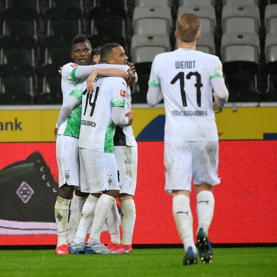 3月11日,门兴格拉德巴赫队球员庆祝进球。新华社发(乌尔里希·胡夫纳格尔摄)