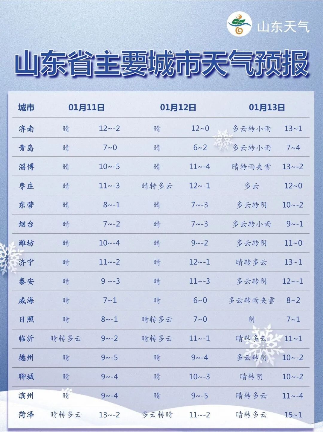 预计未来两天,山东天气晴好,南风为主,气温回升,最高气温将达15℃;13日,鲁中和半岛地区局部有小雨。13日夜间冷空气开始影响我省,气温下降。