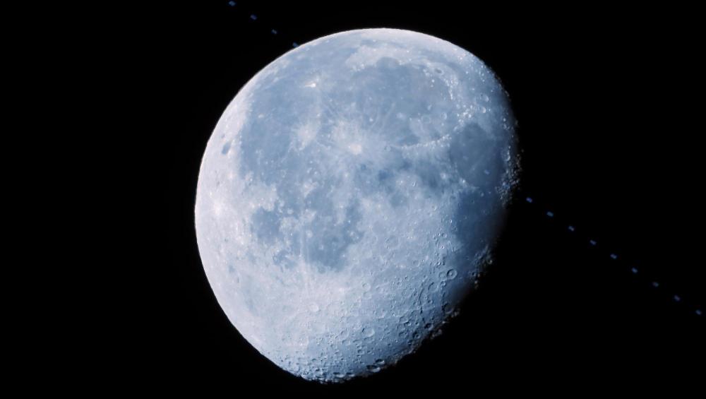 2021年11月24日,在北京拍摄到中国空间站从月球表面“掠过”的“凌月”现象(轨迹为多张照片堆栈)。新华社发(闫珉摄)