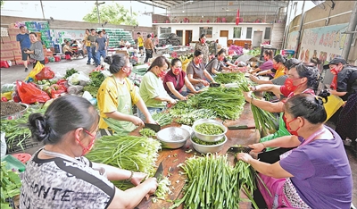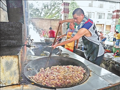 村民们洗菜、切菜、炒菜、打包,场面热火朝天。大家齐心协力,全力保障救灾人员及时吃上热乎饭菜。