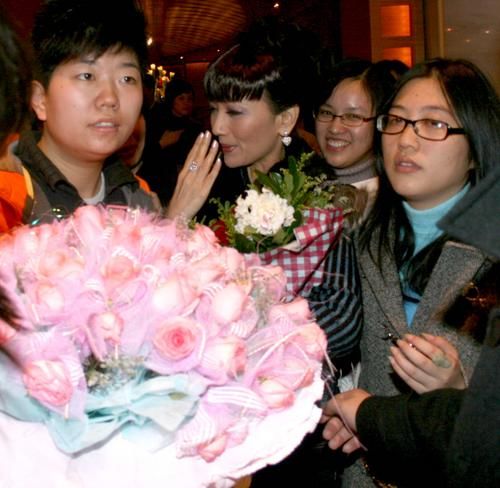 黄锦燊还很配合地把粉丝送的“爱心”举起来让大家拍照其中一位中性打扮的女歌迷甚是抢眼,她手捧着一大束花在门外痴痴等候。当赵雅芝夫妇走出酒店时,粉丝立即围上前索要签名,老公黄锦燊见势急急从人群中挤出来。见过大市面的黄生当然不会和“小朋友”一般见识,还很配合地把粉丝送的“爱心”举起来让大家拍照,把大家“逗”得挺开心。