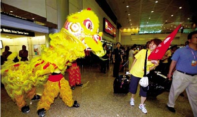 昨天,北京游客在台北桃园机场受到当地舞狮队、高山族歌舞团的欢迎。 新华社记者 陈建力 摄