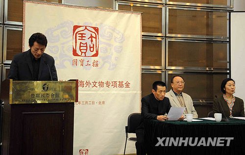 3月2日,中华抢救流失海外文物专项基金副总干事牛宪锋(左一)和圆明园兔首鼠首拍卖现场举牌人后面的委托人蔡铭超(右三)在新闻发布会上(新华社记者 罗晓光 摄)