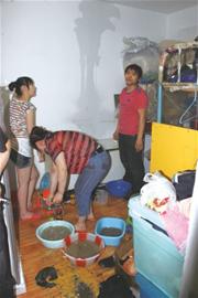 记者来到5楼看到,5楼一家人正在忙着扫水,已经接了3盆水,而客厅里墙面被水浸透,很多墙皮脱落,客厅里一片狼藉,衣服、电器等不少物品都泡在水中。“漏水的时候我们不在家,回来打开门就看到家中的水都漫过了脚背。”5楼的住户告诉记者,起初他们以为是自己家中漏水,后来发现墙都湿了才知道是楼上漏水,但上去敲门一直没人应,于是四处打听才拨通了6楼郭先生的电话。