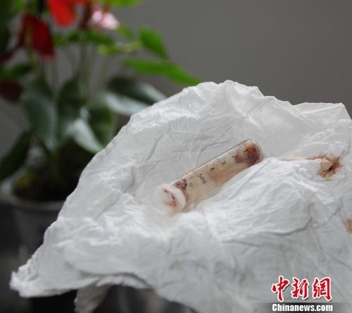 张华一个月前从口中吐出的注射器针筒,至今血迹斑斑(刘良伟 摄)