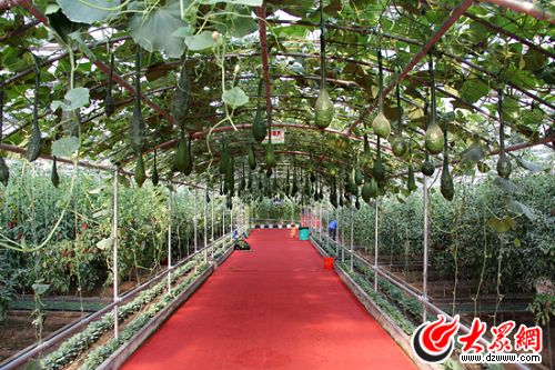 无“土”生金、独“树”成林、万“果”同根,一走进展示大厅,众多的蔬菜艺术品立刻让人眼花缭乱。一棵棵绿油油的蔬菜整齐地“长”在管道、廊架上和展示池中,按比例配好的营养物质放进水里便融化成营养液,管道则把这些营养液输送给植物根系,只需要给它点阳光。据了解,由于蔬菜在土壤中连年种植后,积累的盐分和根结线虫等病虫害对作物根系的危害很大,而无土栽培便有效地解决了重茬问题。像这种“水培”模式不仅不会污染环境,而且使单位面积的产量至少提高5倍,由于营养直接充足供给,叶菜植物的生长期比在土壤里更短。