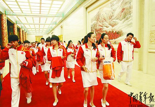 7月10日,参加中国奥运代表团成立大会的年轻运动员走在人民大会堂里