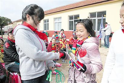 在上甲小学的教室前,志愿者们亲手给学校选出来的40名家庭贫困儿童戴上了围巾和手套,并把书包和学习用具送给每个孩子。