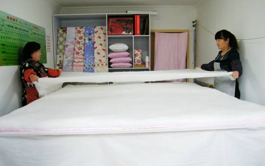 进一步了解后,记者得知,绿桑坊的每一床蚕丝被都是这样经过扯、拉、熨、铺、衔、缝、整等十三道工序手制而成,做工精良细致,均称不差丝毫,称它是一件手工艺术品一点也不为过,这不得不让记者为之叹服。也许,正是这种近于苛刻的精益求精,才使得绿桑坊能够在激烈的市场竞争中脱颖而出。