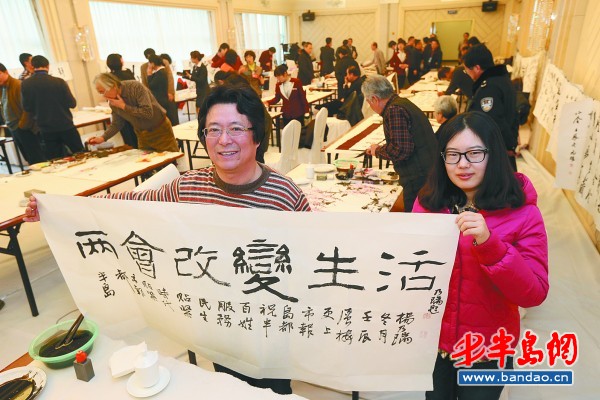 1月6日,参加市政协十二届二次会议的委员们相继赶往黄海饭店、八大关宾馆报到 。连日来一直关注着本报“幸福进家”活动的市政协委员、市书法家协会副主席杨乃瑞,率先将自己的一幅作品捐了出来,要为贫困家庭出一份力,在场的很多书画家也挥毫泼墨,表示要捐助自己的作品奉献爱心。