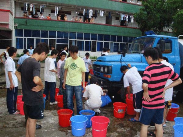 炎炎夏日,停水断电,学校的正常秩序一下子打乱了。生活用水花钱请人送,于是出现学生拎着水桶在水罐车旁排长队的场景;电灯不亮,用蜡烛代替,每当夜幕降临,课堂里、寝室中烛光摇曳,随处可见师生在微弱光线下工作、学习的画面。