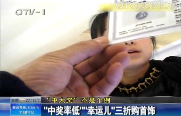 当记者表示自己看中了一件一千多元的首饰,但是没有购物小票不能刮奖时,售货员说,虽然中奖有折扣,但是中奖率很低。随后又介绍,现在商场正在搞活动,可以打八折。