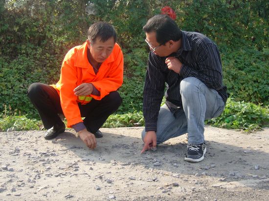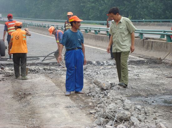 出发20分钟后,工作车到达第一个工作地点。这里的工人师傅们正在开展伸缩缝工程施工。“切割一定要顺直,路面边口要保证完整,”到作业区停好车,曹利清就蹲下来仔细检查,丝毫没有顾忌到现场呛人的灰尘四扬,“注意不要伤害里面的钢筋啊,”他一边伸手检查着开凿曝露出来的钢筋,一边着重给施工人员强调着,“清缝要彻底,不要留下任何杂物,我一会再回来检查啊”。