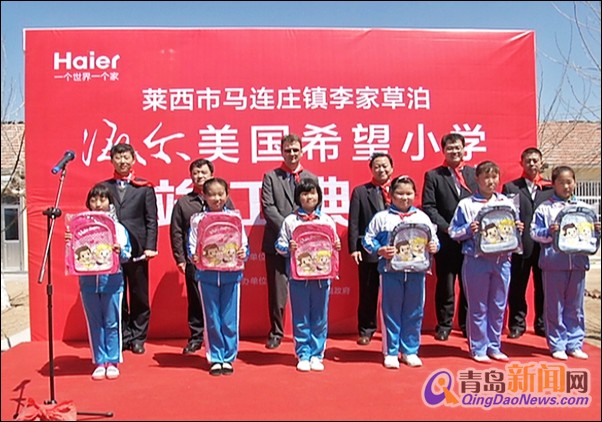4月25日,莱西市马连庄镇李家草泊美国海尔希望小学揭牌仪式举行,海尔集团在全国援建的第165所希望小学建成。莱西市政府、青岛市团委、海尔集团等相关领导出席了本次揭牌仪式,并进行了捐赠活动。尤其需要指出的是,这所希望小学是由美国海尔贸易公司出资援建的。