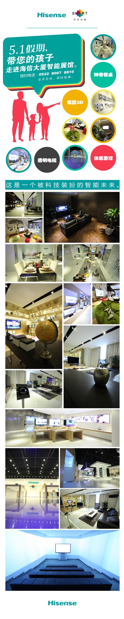 炫目的3D影院,隐形的透明电视,神奇的餐桌…这是一个被科技装扮的智能未来。五一,带您的孩子走进海信大厦智能展馆吧!全天无休,预约免费。预约电话:0532-80878810