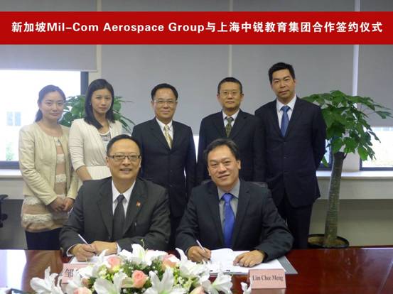 2013年4月26日,新加坡Mil-Com Aerospace Group(新加坡明康宇航集团,以下简称Mil-Com)与中锐教育集团()在上海举行国际航空服务人才合作签约仪式。根据协议,双方将在中国华东地区共建航空服务国际化人才培养的航空公司,打造中国航空培训第一品牌。