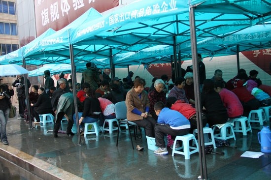 今天虽然气温骤降,下起了雨,但丝毫没有影响亨达孝亲鞋感恩活动市民和网友的参与热情,现场充满了浓浓的亲情氛围。100个洗脚盆在亨达时尚品牌生活馆两侧一字摆开数百米,100个家庭儿女俯下身来跪在地上,给100名父母长辈洗脚按摩,场面蔚为壮观,规模堪称全国之最。