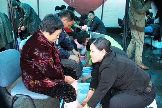 100组家庭现场为父母洗脚,虽然下着雨,现场却充满了浓浓的亲情氛围