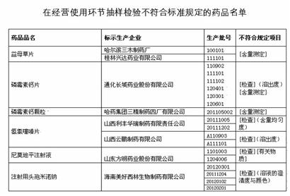 益母草片(颗粒)、保和丸、藿胆丸、磷霉素钙片、破伤风抗毒素、尼莫地平注射液、氢氯噻嗪片、维生素C注射液、养阴清肺膏(丸)、注射用青霉素钾(钠)……在采访中记者了解到,国家食品药品监督管理部门本次抽检选取的药品以国家基本药物为主,而且很多都是我们生活中经常可以见到的“熟面孔”。除了流通环节6种不合格药品外,食品药品监督管理部门还在药品生产领域进行检测,并且查出了桂林兴达药业有限公司生产的益母草片、湖南省回春堂药业有限公司生产的益母草颗粒、海南美好西林生物制药有限公司生产的注射用头孢米诺钠、山东方明药业集团股份有限公司生产的尼莫地平注射液4种药品存在问题。