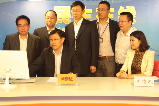 青岛市人防办副主任刘崇进(一排左一)与网民在线交流 (周琦 摄)