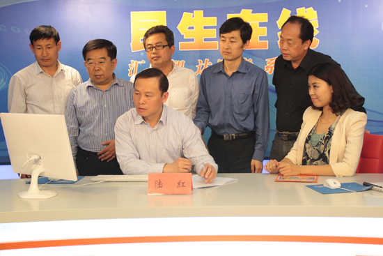 青岛市畜牧兽医局总畜牧师陆红(一排左一)与网民在线交流 (周琦 摄)