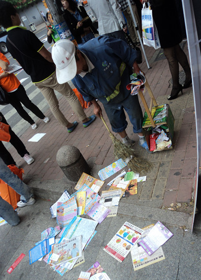 青岛新闻网6月11日讯 今天上午8点半,全市84500名毕业生参加初中学业考试。记者在青岛19中考点外发现,考场外除了送考的家长,更是上演了另一番“招生现场会”,一些学校、培训机构和辅导班的宣传人员在考场外打响招生广告大战。随着考试的进行,部分考生家长陆续离开,考场外变成了“垃圾的海洋”。
