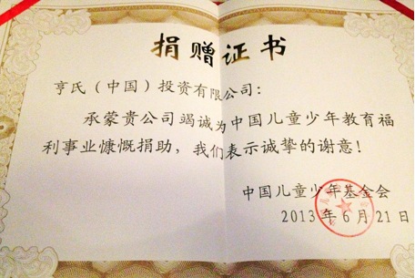 中国儿童少年基金会颁发给亨氏(中国)投资有限公司的捐赠证书