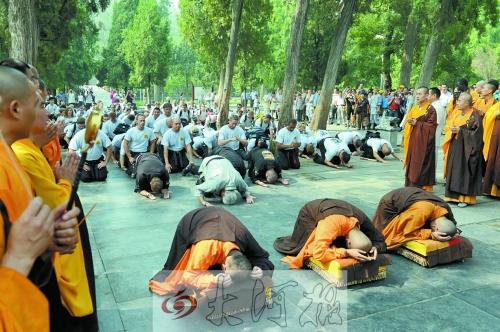 昨日上午9时,洋弟子们列队静候在少林寺山门前,等待拜谒仪式。随后,少林寺方丈释永信身披大红袈裟,在全套仪仗的护送下来到山门,登上礼仪台。释永信致词后,回家归根的洋弟子抱拳,齐诵“阿弥陀佛”,并依照中国最隆重的礼仪,向少林寺、少林寺方丈九行跪拜大礼。