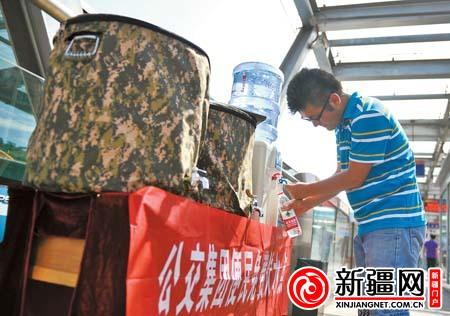 4日,在BRT 1号线儿童公园站,市民李当志在站台内的免费饮水点接水。