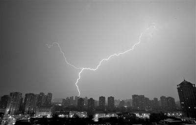 7日凌晨,东北四环一道闪电划破夜空。记者 薛珺 摄