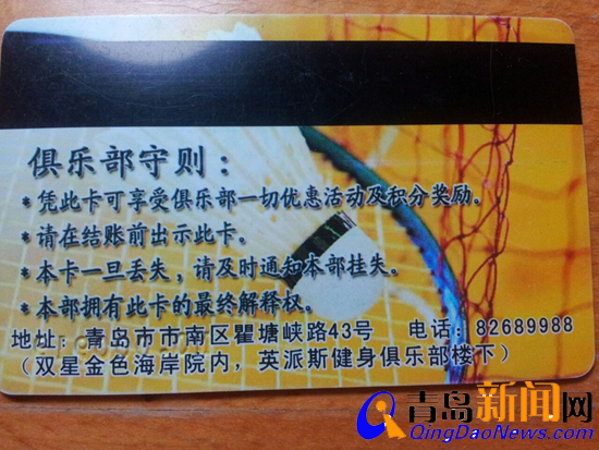 对于后续的维权事宜,谈先生表示:“我们几个会员曾打过12315,还有12345之类的投诉热线,协调结果总是羽毛球馆老板与英派斯、双星三方需要协商处理,我们也找过市南区台西路工商所反映情况,他们也只是各方协调,事情至今没什么进展。”谈先生说道,本来协调结果是等新馆开业后,原有会员全部入驻继续消费,但现在新馆开业已半年,依旧未有进展,而英派斯也曾接管过羽毛球馆的电脑,统计过老会员信息及卡内余额,而统计后便再次杳无音讯。