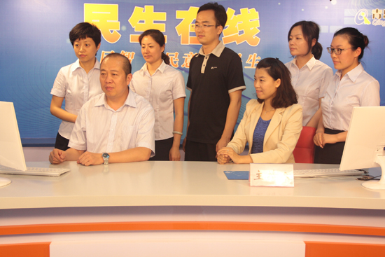 太平洋产险青岛分公司副总经理侯传和(一排左一)与网民在线交流(周琦 摄)