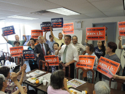 刘醇逸在掌声中绕行全场,坚持握到每一双手,与老人们眼神交流,用中文喊“叔叔、阿姨好”。适逢午餐时间,他挽起衣袖,亲自为大家盛饭,有人打趣“吃了就一定要投”。老人中心主任王能、主席罗一玲、法拉盛商业改进区(BID)共同主席庄振辉、法拉盛狮子会会长孟淳仁、后援会成员张永良等人手举海报,发言强调经济不好,需要选一个能帮大家省钱、不找小商家麻烦的市长;刘醇逸是首位当选市议员、市主计长的华人,现在要当纽约市第一位华人市长,并呼吁所有人一定要投票。