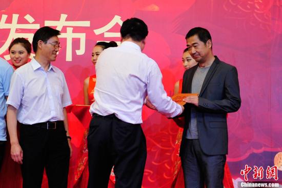 7月12日下午三时,2014年央视春晚在北京举行发布会,揭秘各项具体事项,包括公布导演名单。图为发布会现场,张国立获颁聘书。中新网记者 金硕 摄