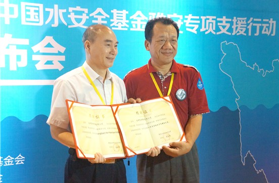 猎豹汽车品牌总监王粤江先生与中国水安全基金发起人邓飞先生共同展示雅安新建净水点计划