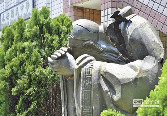 中新网7月16日电 据台湾《中国时报》报道,台湾桃源县新屋乡永安中学不敌“苏力”台风侵袭,校舍屋顶的60米长铁皮遭强风吹掀,掉落时宛若“血滴子”横扫校园,硬生生将十几米高的树干从中剖半,更“斩首”孔子雕像,头颅恰好滚落雕像手上,形成诡异景象。这尊手捧头颅的“无头孔子”,有人认为是不祥象征,有人则认为纯属巧合。