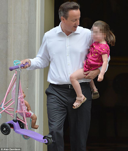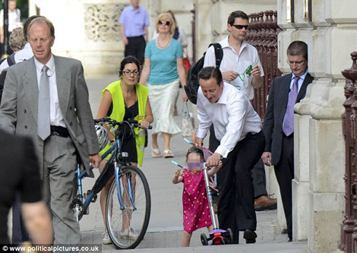 在把孩子送到幼儿园后,卡梅伦回到唐宁街,把首相府的猫拉里哄进房间,随后开始工作。
