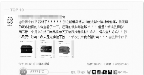 由于好奇,他在淘宝上搜了一下“棺材”,之后的一个月里,每当他打开新浪微博,都会看到骨灰盒、寿衣之类的广告推介信息。业内人士称,很多网站都是“共享用户数据”,好处是可以为用户提供精准信息,坏处是让用户有隐私被泄露的感觉。