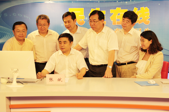 青岛市粮食局局长张斌(一排左一)与网民在线交流 (周琦 摄)