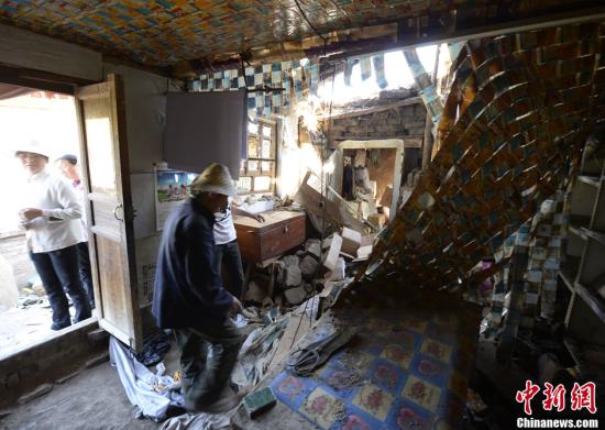 7月22日7时45分,甘肃省定西市岷县、漳县交界发生6.6级地震。据了解,地震致岷县多个乡镇受灾,有些乡镇房屋倒塌严重。图为甘肃省定西市岷县蒲麻镇吊沟村民正在房屋废墟中搜寻抢救能使用的物资。中新社发 侯宇 摄