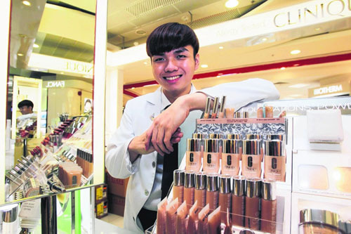 在新加坡长堤坊一楼的美容专柜员当中,华人郭铠铭(24岁)是唯一的男专柜员。(蔡婉婷 摄)