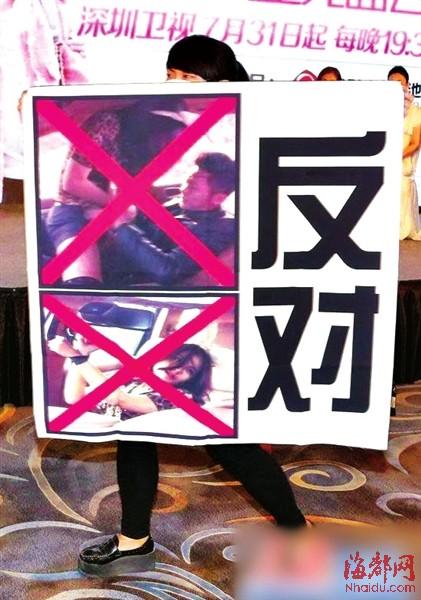 22日,由刘涛主演的新剧《今夜天使降临》在北京举行首播发布会,剧中刘涛与男主角玩“车震”,尺度之大令人咋舌。当日,当发布会进行到一半时,十几个戴着“禁止”口罩、举着横幅的年轻人突然冲进现场,在众多记者面前打开横幅,横幅上赫然写着:“反对刘涛角色露骨、台词暧昧,还我女神!”现场一度混乱,刘涛在台上也十分震惊。后经工作人员多方劝阻,这十几人才离开现场。