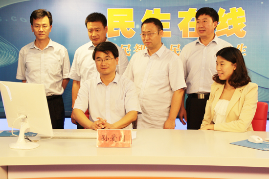 青岛市地震局副局长孙爱国(一排左一)与网民交流 (周琦 摄)