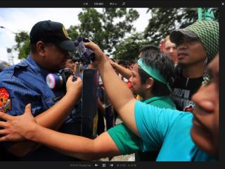 菲律宾总统阿基诺三世22日下午在众议院发表国情咨文。防有心人滋事,警方2天前展开监控并设置路障,果然在他演说数小时前,大批示威者与镇暴警察对峙,棍棒石块齐飞,警民共约60多人挂彩。