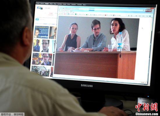 美国“棱镜”监控计划泄密者爱德华•斯诺登于莫斯科时间7月12日在莫斯科谢列梅捷沃机场与多家人权机构代表人士举行会谈。图为一人在机场内的电脑上观看期诺登会谈时的图片。