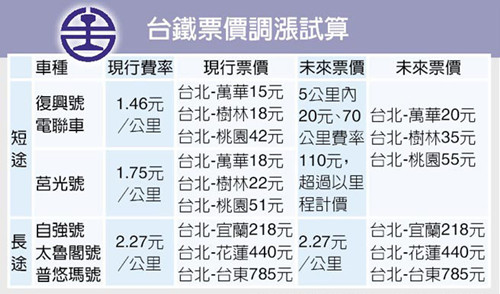 台铁目前票价为1995年制定,当时依成本及载客状况,设定基本费率为每人每公里1.01元,再根据列车等级,计算出自强号每公里2.27元、莒光号1.75元、复兴号及电联车1.46元的费率,依照行驶里程计算票价,最低票价为15元。