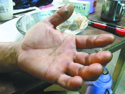 因为没戴手套,饶启国碰到晒得滚烫的铝模板,大拇指被烫了一个血泡。