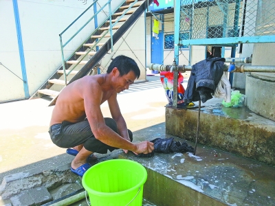 “走啊,去洗澡啊!”上午11点,下班的“吼声”响起,30多人陆续下楼回到宿舍。淋浴的龙头不够用,大多数工人抄起脸盆接水就往头上淋:“好爽啊!爽!爽!爽!”大家相互嬉闹,来不及擦干头发,就往食堂跑。