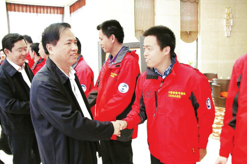 刘赐贵指出,目前我国极地考察形成了“一船四站”的工作格局,国家对极地考察事业的投入也在逐年增加,极地考察破冰船建造、固定翼飞机购置等工作正在有序推进,各相关单位要认真做好每项工作,扎实推进南极考察强国建设。刘赐贵细心询问了队员的训练情况和身体状况。他说,南极伊丽莎白公主地内陆夏季站建站的队员肩负着建立新考察站的光荣使命和任务,全体队员要刻苦训练,提高在南极的适应能力,发扬南极精神,按期圆满完成新建考察站的任务,为建设海洋强国做出更大的贡献。